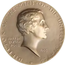 Mint Director Nellie Tayloe Ross had long been an admirer of Benjamin Franklin, and wished to see him on a coin.[2] In 1933, Sinnock had designed a medal featuring Franklin, which may have given her the idea.[2] Franklin had opposed putting portraits on coins;[3] he advocated proverbs about which the holder could profit through reflection.[4] In a 1948 interview, Ross noted that Franklin only knew of living royalty on coins, and presumably would feel differently about a republic honoring a deceased founder.[3] Indeed, Franklin might have been more upset at the reverse design: as numismatic writer Jonathan Tepper noted, "Had Benjamin Franklin known that he would be appearing on a half dollar with an eagle, he most likely would have been quite upset. He detested the eagle, and numismatic lore has it that he often referred to it as a scavenger. Given the practical man that he was, Franklin proposed the wild turkey as our national bird."[5]