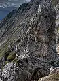 Frau Hitt was probably first climbed in 1580 by Johann Georg Ernstinger. It was conquered several times during the 19th century by unknown mountaineers.[4] Frau Hitt is usually climbed via the west shoulder (at one place III, otherwise II). To reach this shoulder there is a route from the east (grade II) and a rather more difficult one (III+) from the west.