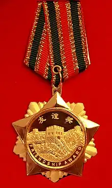 The Chinese Government's Friendship Award (simplified Chinese: 中国政府友谊奖; traditional Chinese: 中國政府友誼獎; pinyin: Zhōngguó ZhèngYǒuJiǎng; lit. 'Chinese Government's Friendship Award') is the People's Republic of China's highest award for "foreign experts who have made outstanding contributions to the country's economic and social progress".[1] The award was first established in 1950s, when it was awarded to experts from the former Soviet Union and East European countries by the then premier Zhou Enlai and the foreign minister Chen Yi.[2] On September 15, 1955, the Chinese government decreed that each departing Soviet expert be issued a medal.[3] This medal featured the flags of China and the Soviet Union along with the inscription "Long live the Sino-Soviet Friendship" (Chinese: ; pinyin: ZhōngYouWànsuì).[3] The friendship award was abolished with the Sino-Soviet split in the early 1960s. During the period that followed, in particular the Cultural Revolution, foreigners in China were often regarded as "spies" and very few remained in the country.[3]