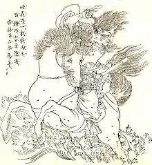 To secure spiritual support for the mission, Azumabito was ordered to pray to Hachiman, the god of war.[29] This was one of the first crises in which people resorted to Hachiman as a kami of power.[12] A messenger was sent to make offerings at the Ise Grand Shrine and Shōmu ordered that seven-foot-high statues of Kannon bosatsu be cast and sutras copied and read in all provinces.[33][35]