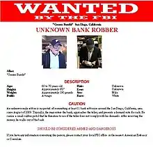 1. "Unknown Bank Robber". FBI. Retrieved 2010-12-06.; "The 'Geezer Bandit' Strikes Again". ABC News. November 16, 2010. Retrieved 2010-12-06.; "Geezer Bandit expands his reach to Bakersfield in 12th robbery". LA Times. November 16, 2010. Retrieved 2010-12-06.; "'Geezer bandit' wanted in string of bank robberies". LA Times. June 25, 2010. Archived from the original on 2012-10-01. Retrieved 2010-12-06.