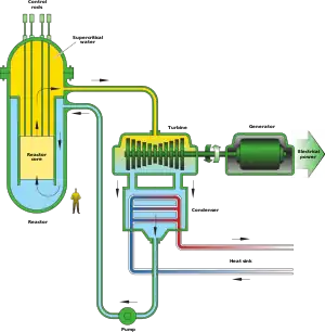 The supercritical water reactor (SCWR)[26] is a reduced moderation water reactor concept. Because the average speed of the fission-causing neutrons within the fuel is faster than thermal neutrons, it is more accurately termed an epithermal reactor than a thermal reactor. It uses supercritical water as the working fluid. SCWRs are basically light water reactors (LWR) operating at higher pressure and temperatures with a direct, once-through heat exchange cycle. As commonly envisioned, it would operate on a direct cycle, much like a boiling water reactor (BWR). Since it uses supercritical water (not to be confused with critical mass) as the working fluid, it would have only one water phase. This makes the heat exchange method more similar to a pressurized water reactor (PWR). It could operate at much higher temperatures than both current PWRs and BWRs.