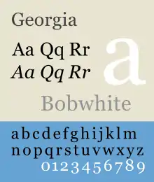 Georgia was designed for clarity on a computer monitor even at small sizes.[5] It features a large x-height (tall lower-case letters), and its thin strokes are thicker than would be common on a typeface designed for display use or the greater sharpness possible in print.[6][7] Its reduced contrast and thickened serifs make it somewhat resemble Clarendon designs from the 19th century. The glyphs were manually hinted.[8]