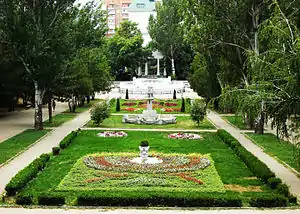 A wooden building of the first Municipal Theatre opened in the northern side of the park in the 1840s. Wooden rotunda to relax of citizens was erected in 1864. It was replaced by stone building located on Pushkinskaya street alongside of main park entrance in 1893. Architect Nikolai Doroshenko designed an open-work fence and front entrance constructed in the shape of fortress gates. New entrance was located on Bolshaya Sadovaya street. Architect Vladimir Shkitko projected the first fountain in Rostov-on-Don called 'Boy with basin'. The opening ceremony was held in conjunction with relocation of the town council to new building (Maximov house). The fountain was officially opened by projector of water pipe Timofey Petrovich Kuska.[4] Pool and arbors were decorated with sculptures opened in middle porch of the park. At the Lower Park was a stone grotto, reservoir with alive swans and fountains.[5] Flower ornaments were regularly renovated. A large area of new exotic plants and flowers was laid out. Palm trees and tamarisks were brought from abroad.[6]