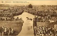 The Grand Steeple-Chase des Flandres (Grote Steeple-chase van Vlaanderen; "great steeplechase of Flanders") is a horserace held annually at the Hippodrome Waregem in Waregem, Belgium. It is the centrepiece of the Waregem Koerse ("Waregem Races") meeting, held on the Tuesday of the Waregem Koerse Feesten, a kermesse which begins on the weekend of the last Sunday in August.[1][2] Local businesses often close for the kermesse.[2] The race is sometimes described as the Belgian Grand National, by analogy with the (English) Grand National.[2][3] It has a distance of 4600m, with 25 obstacles, the most spectacular of which is the water jump across the Gaverbeek river, which is in front of the grandstand and taken twice in the race. In 1990 the water jumpwas redesigned to reduce the frequency of horses breaking legs; it faced continued criticism from animal welfare activists after deaths there in 2012.[2][3] The Waregem Koerse was first held in 1849 on the city's cobbled streets;[2] the Steeple-Chase was first held in 1858, sponsored by French businessman Marc Lejeune.[1] In its early decades it was one of the most prestigious horseraces in Europe.[1] It declined after the Second World War when French prize money grew, but recovered somewhat from the 1980s. In the 1990s there was an increase in the number of British entries, from smaller stables.[2] Multiple winners include Spectre (five wins in the 1870s), Redpath (seven wins 1880s–1890s) and Taupin Rochelais (three wins 2015–2017).[4][5] Since 2010 the race has formed part of the Crystal Cup series of European steeplechases.