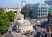 The station was part of the world's first underground railway, the Metropolitan Railway, which opened between "Bishop's Road" (now Paddington) on the Hammersmith & City line and "Farringdon Street" (close to the present-day Farringdon station). It was opened on 10 January 1863 as "Portland Road", changed to its present name on 1 March 1917 but was renamed "Great Portland Street and Regents Park" in 1923 and then reverted to its present name in 1933.[7] The current structure was built in 1930 on a traffic island on the Marylebone Road at its intersection with Great Portland Street and Albany Street. Its construction is a steel framed cream terracotta clad exterior, with the perimeter providing shops and originally a car showroom with office space over the station. Great Portland Street was at a major sales location for the motor industry. It was designed by the Metropolitan Railway's architect C. W. Clark and was Grade II-listed in January 1987.[8]