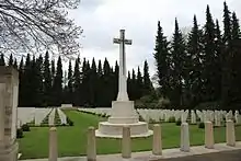 The structures and plantings in this war cemetery are in compliance with the CWGC standards.[6] Looking out over the cemetery, numerous rows of graves are visible. In the background, there is a Hall of Remembrance as a landmark. This cemetery was designed by Robert Lorimer.[7]