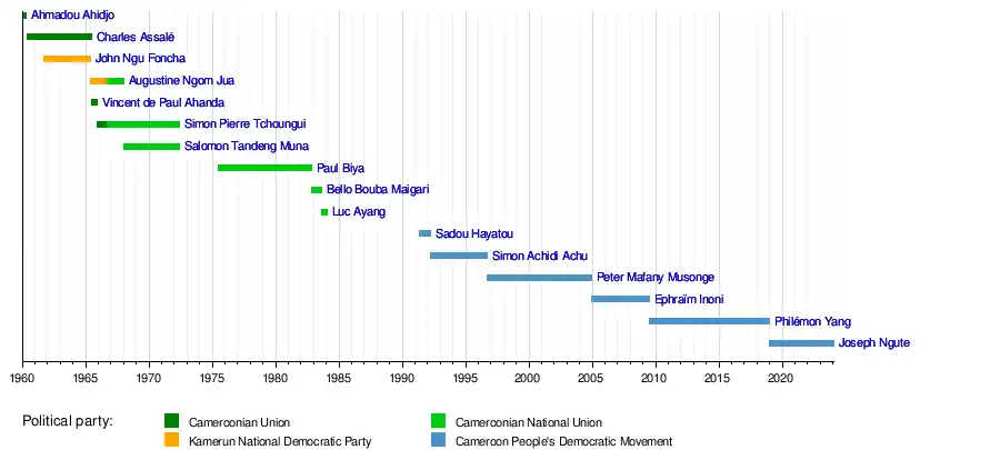 This is a list of prime ministers of Cameroon since the country gained independence from France in 1960 to the present day.