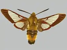 There is a transparent discal cell on the forewing that is generally divided longitudinally by a vestigial scaled fold. The hindwing upperside very similar to Hemaris ottonis.