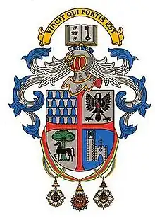 From the old historic books kept at the Diocesan Historic Archive in Logroño it is known that the first member of the Garcia De Gonzalo family is recorded in the first book, page 10, the year 1529 with the name Hernan De Garcia, father of Pedro De Garcia. In 1605 Juan de Garcia y Soto (the young), was granted to add to his last name De Gonzalo as a reward for fighting the Moors for many generations. The first time he used the last name Garcia De Gonzalo was when he married Isabel de Baldecantos, in Enciso.[3] From that moment on the last name Garcia De Gonzalo was used for eight generations. Hernan Garcia Vidal great grandfather, Faustino Garcia De Gonzalo, was the one that cut off the last name De Gonzalo. Hernan Garcia Vidal, the fourteenth generation, on January 26, 2003, recovered De Gonzalo. The coat of arms was certified in 2012 by Alfonso de Ceballos-Escalera Gila, Duke of Ostuni, Visconti of Ayala, Marques de la Floresta in charge of The board of Castilla y Leon, by the Royal Decree of July 29, 1915.[4]