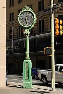 The Hertzberg Clock is an historic landmark and visitor attraction[1] located at the corner of N. St. Mary's and Houston streets in the Bexar County city of San Antonio in the U.S. state of Texas.[2] Installed in 1878 in front of Eli Hertzberg Jewelry Company, it was made by E. Howard & Co. of Boston, Massachusetts. The freestanding town clock was donated to the San Antonio Conservation Society in 1982 by the daughters of its original owners, Max and Nell Goodman.[3] A 1985 restoration was made possible through donations of time and money from Republicbank San Antonio, John J. Duff, master watchmaker and clockmaker, London Watch and Clock Company; and Kurt, Ted, and Al Voss, Kurt Voss Metals, Inc. The clock is hand wound and maintains time through a series of weights.[4]