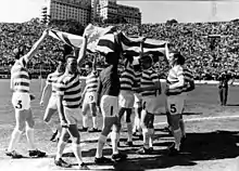 Celtic are one of only two clubs to have won the trophy with a team composed entirely of players from the club's home country; all of the players in the side were born within 30 miles of Celtic Park in Glasgow, and they subsequently became known as the 'Lisbon Lions'.[150] The entire east stand at Celtic Park is dedicated to The Lisbon Lions,[151] and the west stand to Jock Stein.[152] The sight of captain Billy McNeill holding aloft the European Cup in the Estádio Nacional has become one of the iconic images of Scottish football.[153][154][155][156] A statue outside Celtic Park showing Billy McNeill with the European Cup was unveiled in December 2015.[156]