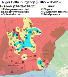 Meanwhile, IPOB suspected militants attempted to disrupt the preparations for the 2023 Nigerian elections, attacking offices of the Independent National Electoral Commission (INEC) across the southeast. INEC responded by increasing its efforts at registration drives, though remained hampered by logistical issues.[117][118][119] In September, gunmen attacked the convoy of Senator Ifeanyi Ubah of the Young Progressives Party at Enugwu-Ukwu; five people were killed, though the senator remained unharmed.[120] IPOB continued to accuse local security forces of cooperating with militant herdsmen and Islamists, describing the new head of the 82 Division, Major General Ahmed Chinade, as "another Fulani stooge and Igbo hater" who previously had killed and abused "Biafrans" in the Port Harcourt area.[121] On their part, the security forces attempted to contain the militant activities which were disrupting the election preparations, launching security sweeps and capturing or killing some suspected ESN militants.[122] The police also reportedly seized a weapons stockpile assembled by Oduduwan nationalists.[123]