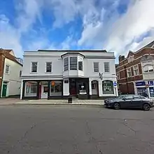 Daniel Defoe described Rebow's home in Head Street, Colchester as a "very good house".[24] It was built in the late seventeenth century (possibly incorporating some timber framing from an earlier property) above medieval cellars,[23]: 2 which he may have used to store goods as part of his mercantile activities.[28]: 38-39 An inventory of the house produced in June 1735, nine years after Rebow's death, lists seventeen rooms, two servants' garrets, cellars, a brewhouse, yards, a stable and a coach house.[29]: 24 An illustration on James Deane's 1745 map of Colchester depicts the house with a substantially different façade to that now visible, showing a low attic, a large central dormer and three windows each side of the central axis, rather than the current two.[23]: 6 A 2016 assessment of the building's fabric found features consistent with this depiction,[23]: 21-22 but it has also been claimed that it may show an unbuilt design for the rebuilding of the house, abandoned when the Rebow family moved to Wivenhoe Park.[30]: 37 The house's present façade and oriel window date from the eighteenth or early nineteenth century, with shopfronts inserted in the late nineteenth century and the original rusticated entrance door surround removed in the mid twentieth century.[23]: 21-22 Panelling and fireplaces contemporary with Rebow are still in situ inside the house.[23]: 2 It is now a Grade II* listed building[31] known as Rebow House and, following a restoration completed in 2021 by its current owners, the Tollgate Partnership, comprises three offices and a shop.[32] Wallpaper dating back to the 1700s which was found during the restoration has been framed and left visible.[33] The 1745 map show substantial gardens behind the house, subsequently built on.[23]: 3 To the south, running parallel with the side of the house and the site of its gardens, lies Sir Isaac's Walk, a road which Rebow "gravelled and made handsome" according to the eighteenth century historian Philip Morant.[34]: 4