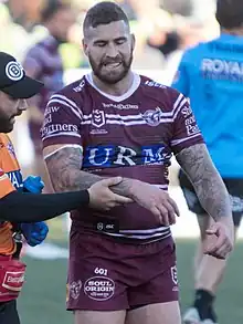 On 10 February 2017, Thompson played for the Indigenous All Stars against the World All Stars in the 2017 All Stars match, starting at second-row in the 34–8 win at Hunter Stadium.[33] In Round 1 against the Penrith Panthers, Thompson scored his first career hattrick of tries in the Dragons impressive 42–10 win at Jubilee Oval.[34] Thompson finished the 2017 NRL season with him playing in 24 matches and scoring 9 tries for the club. On 22 December 2017, Thompson was granted a release from his final year of contract with St. George to sign a 2-year deal with the Manly-Warringah Sea Eagles, starting in 2018.[35][36]