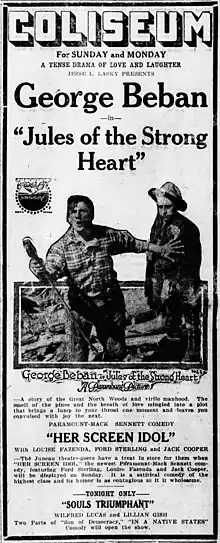 Jules of the Strong Heart is a lost[1] 1918 American silent drama film directed by Donald Crisp and written by William Merriam Rouse, Frank X. Finnegan' and Harvey F. Thew. The film stars George Beban, Helen Jerome Eddy, Charles Ogle, Raymond Hatton, Guy Oliver, and Ernest Joy. The film was released on January 14, 1918, by Paramount Pictures.[2][3]