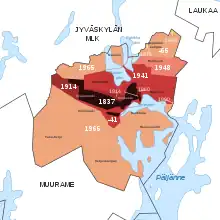 Vaajakoski and Palokka started growing in the 20th century, eventually merging into the built-up area of Jyväskylä in the 1980s while still remaining parts of Jyväskylän mlk.[3] While the municipality gradually lost territory to the growing town,[4] Jyväskylän mlk also acquired some territories from neighboring Laukaa,[5] specifically from the register villages of Savio, Leppävesi and Vehniä. Small parts of Haukanmaa were also transferred from Toivakka to Jyväskylän mlk in 1975.[6]