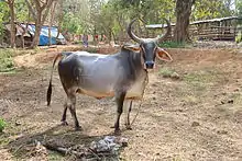 The Kankrej (Hindi: कंकरेज) is an Indian breed of zebuine cattle. It originates from the arid region of the Rann of Kutch in the state of Gujarat, and in neighbouring Rajasthan. Under the name Kankaraj, it is also present in Tharparkar District, in Sindh, Pakistan. It is also known by the names Bannai, Nagar, Talabda, Vaghiyar, Wagad, Waged, Vadhiyar, Wadhiar, Wadhir and Wadial.[4] It is a dual-purpose breed, used both for draught work and for milk production.