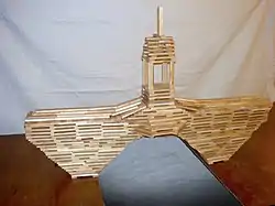 Kapla is a construction set for children and adults. The sets consist only of identical wood planks measuring 11.7 cm x 2.34 cm x 0.78 cm. This 15:3:1 ratio of length:width:thickness is different than the dimensions used for traditionally proportioned building blocks (such as unit blocks), and are used for building features such as lintels, roofs and floors. They are known for their stability in the absence of fastening devices.[1]