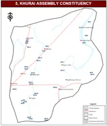 Khurai assembly constituency is the 3rd of the 60 assembly constituencies of Manipur. It has 43 parts namely: 1-Khomidok (A), 2-Khomidok (A-1), 3-Khomidok (B), 4-Khomidok (B-1), 5-Khabeisoi (A), 6-Khabeisoi (B), 7-Sangomsang (A), 8-Sangomsang (B), 9-Phaknung, 10-Kangla Siphai, 11-Sajeb (A), 12-Sajeb (B), 13-Angom Leikai, 14-Moirang Kampu, 15-Khurai Konsam Leikai(A-1), 16-Khurai Konsam Leikai(A-2), 17-Khurai Konsam Leikai (B), 18-Khurai Konsam Leikai (C), 19-Kongpal Sajor Leikai (Awang), 20-Kongpal Sajor Leikai (Makha), 21-Khurai Thongam Leikai, 22-Khurai Thoidingjam Leikai (A), 23-Khurai Thoidingjam Leikai (B), 24-Khurai Sajor Leikai, 25-Khurai Puthiba Leikai (B), 26-Khurai Puthiba Leikai, 27-Khurai Nandeibam Leikai, 28-Khurai Laishram Leikai (A), 29-Khurai Laishram Leikai (B), 30-Ningthoubung, 31-Ningthoubung Khunou, 32-Khurai Kongpal Chingangbam Leikai, 33-Khurai Sajor Leikai (Makha), 34-Khurai Kongpal Chingangbam Leikai (B), 35-Khurai Kongpal Chingangbam Leikai (B-1), 36-Khurai Chingangbam Leikai(C ), 37-Khurai Chingangbam Leikai(D-1), 38-Khurai Chingangbam Leikai(D-2), 39-Khurai Kongkham Leikai (A), 40-Khurai Kongkham Leikai (B), 41-Khurai Kongkham Leikai (B-1), 42-Khurai Khongnangmakhong(A), and 43-Khurai Khongnangmakhong(B).[4]