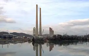 The plant has nine generating units: Units 1–4, rated at 175 MW each (launched into service in 1954), and Units 5–9, rated at 200 MW each (launched in 1955).[8] Combined, the plant has a total capacity of 1,700 MWe (1,398 MWe net). It produces about ten billion kilowatt hours of electricity from some five million tons of coal each year. All nine generating units are equipped with selective catalytic reduction (SCR) systems to reduce nitrogen oxide (NOx) emissions that contribute to the formation of ozone.[5][9] In 1976, its original nine stacks were taken out of service (though left standing) and replaced by a pair of 1,000-foot (304.8 meter) tall chimneys, one for Units 1–5 and one for Units 6–9.[10] These stacks were replaced with a single stack connected to scrubbers which were installed in 2007.