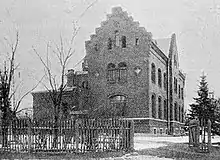 The factories were built with limestone from a local quarry; all the structures for workers were built with logs.[7] As the Baltic Sea is only about 16 km away, large cotton warehouses were erected in the harbour at the mouth of the river where cotton, imported directly from the United States or Liverpool, was stored and brought up the river to the mill as needed.[8] A new spinnery was built on the island in 1870, and the company bought the adjacent Georgiyevsky Island in 1872 and built another mill there in 1899.[9] The company also purchased Joala Manor and converted it into a mill in 1884, expanding it in 1890.[9] The complex initially manufactured calico and received its raw materials from the Americas, Egypt, and India. The introduction of the St. Petersburg–Tallinn (Reval) railroad opened up Central Asian markets.[9] In 1893 it contained 340,000 spindles, 22,000 looms, and employed 7,000 people.[10] Professor Gerhart von Schulze-Gävernitz visited the mills in the 1890s stating that "the whole place is a bit of England on Russian ground."[2]