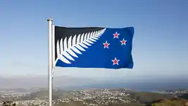 The black, white and blue silver fern flag is a proposed flag for New Zealand by architectural designer Kyle Lockwood. It was first designed using different colours in 2000.[1] It was voted as the preferred alternative New Zealand flag in the first of two New Zealand flag referendums in December 2015, and was used in the second flag referendum in a binding contest against the current New Zealand flag. Despite a UMR poll predicting that the flag would earn only 35% of the vote,[2] the Silver Fern Flag gained a significant minority in the March 2016 referendum with 43.2% of the vote, whilst the existing flag won with 56.6% of the vote.[3]
