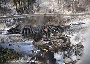 - 28 March – United States – A CSX train travelling through Newton Falls, Ohio with an estimated 100 cars of mixed freight (including hoppers and tankers), suffered a 12-car derailment. Three rail cars fell off a bridge and onto Center Street.[68] Residents within 150 metres of the crash were evacuated.[69][70]