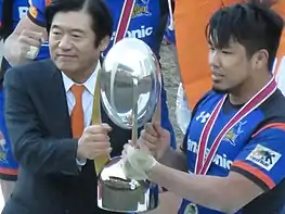 Yoshiaki Fujimori presents the 2016 Lixil Cup trophy to Panasonic captain Shota Horie.