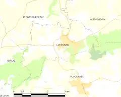 The enclos paroissial or Parish close of Locronan comprises the parish church with adjoining chapel and a calvary. The article will also cover the nearby chapelle Notre-Dame-de-Bonne-Nouvelle. Locronan is a member of the Les Plus Beaux Villages de France ("The most beautiful villages of France") association.[1] The village's name means the "hermitage of Ronan", from the Breton lok which means hermitage, and after the founder Saint Ronan. It has previously been known as Saint-René-du-Bois. Saint Ronan is greatly venerated in Brittany. He was an Irish Christian missionary of the 6th century who came to the region to teach Christianity. As a consequence of Saint Ronan's close association with Locronan some of his relics are kept in the parish church. Locronan is located in the Châteaulin arrondissement of Finistère.