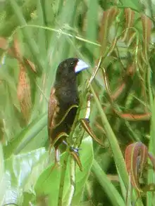 Lonchura is a genus of the estrildid finch family, and includes munias (or minias) and mannikins. They are seed-eating birds that are found in South Asia from India, Bangladesh, Sri Lanka east to Indonesia, Papua New Guinea, and the Philippines. The name mannikin is from Middle Dutch mannekijn 'little man', and also the source of the common name of the family Pipridae, manakin.[1]
