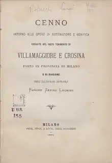- Robecchi Bricchetti, Luigi (1881). Cenno intorno alle opere di sistemazione e bonifica eseguite nel vasto tenimento di Villamaggiore e Crosina posto in provincia di Milano e di ragione dell'illustriss. signore barone Sabino Leonino. Milan: Premiata Tipografia e litografia degli Ingegneri.