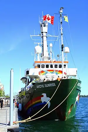 In September 2013, Arctic Sunrise participated in Greenpeace protests against oil drilling activities by the Russian energy company Gazprom at the Prirazlomnaya oil rig in the Pechora Sea. Greenpeace opposes oil drilling in the Arctic on the grounds that oil drilling damages the Arctic ecosystem, and that no safety plans are in place to prevent oil spills. Earlier in August 2012, Greenpeace staged similar protests against the same oil rig.[11] On 18 September, the crew of Arctic Sunrise circled the Prirazlomnaya oil rig, while three crew attempted to board the platform. In response, the Russian Coast Guard seized control of the ship and detained the activists.[12][13][14] The ship was later towed by a coast guard vessel to the Russian Arctic port of Murmansk. The Arctic Sunrise crew consisted of 30 members from 16 nationalities. The Russian government intended to charge the Greenpeace activists with piracy, which carries a maximum penalty of fifteen years of imprisonment,[11] although Russian President Vladimir Putin has said the activists are obviously "not pirates".[15] Putin distanced himself from the case and indicated that the independent Russian judiciary would continue with the investigation. On 23 October 2013 the Russian prosecution altered the charges against the activists, rescinding the piracy allegation and charging them instead with hooliganism. A conviction of hooliganism in Russia can result in costly fines and up to seven years in prison. According to Phil Radford, executive director of Greenpeace in the U.S. at the time, the reaction of the Russian coast guard and courts was the "stiffest response that Greenpeace has encountered from a government since the bombing of the Rainbow Warrior in 1985."[16]