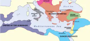 Despite the bad feelings generated at Damietta, Amalric still refused to abandon his dream of conquering Egypt, and he continued to seek good relations with the Byzantines in the hopes of another joined attack, which never took place.[64] In 1171 Amalric came to Constantinople in person, after Egypt had fallen to Saladin. Manuel was thus able to organise a grand ceremonial reception which both honoured Amalric and underlined his dependence: for the rest of Amalric's reign, Jerusalem was a Byzantine satellite, and Manuel was able to act as a protector of the Holy Places, exerting a growing influence in the Kingdom of Jerusalem.[65] In 1177, a fleet of 150 ships was sent by Manuel I to invade Egypt, but returned home after appearing off Acre due to the refusal of Count Philip of Flanders and many important nobles of the Kingdom of Jerusalem to help.[66]