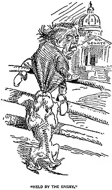 Quay finally answered the allegations against him in February 1891, addressing the Senate, which he rarely did, and calling the allegations "false and foul to the core".[110] This did little to satisfy his opponents, and there were calls for his resignation as RNC chairman. Harrison had long desired his departure, and was unwilling to defend him. Quay in June 1891 announced that he would not lead the next presidential campaign, and resigned the following month.[111] Quay was not supportive of Harrison as the president faced renomination in 1892, but also disliked the only real rival, Blaine.[112] At the 1892 Republican National Convention in Minneapolis, Quay realized that Harrison's renomination could not be prevented, and himself voted for McKinley, by then governor of Ohio, who was third in the balloting although not a declared candidate. Not wishing to be deprived of patronage if Harrison was re-elected, the senator pledged to work for the Republican ticket, but did little until October, when after negotiations and unknown concessions, he appeared at campaign headquarters, and pledged to help raise money. Nevertheless, Harrison was defeated by former president Cleveland.[113] According to Pollock, Quay's "break with Harrison and his failure to take an active part in the campaign of 1892 was [sic] one of the prime factors in the Democratic victory of that year".[72]