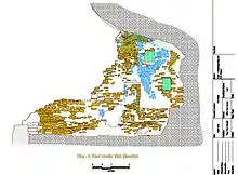 Neutron activation analysis indicates that much of the black-on-white pottery found at Mesa Verde was produced locally. Cretaceous clays from both the Dakota and Menefee Formations were used in black-on-white wares, and Mancos Formation clays for corrugated jars.[90][lower-alpha 9] Evidence that pottery of both types moved between several locations around the region suggests interaction between groups of ancient potters, or they might have shared a common source of raw materials.[90] The Mesa Verde black-on-white pottery was produced at three locations: Sand Canyon, Castle Rock, and Mesa Verde.[91] Archeological evidence indicates that nearly every household had at least one member who worked as a potter. Trench kilns were constructed away from pueblos and closer to sources of firewood. Their sizes vary, but the larger ones were up to 24 feet (7.3 m) long and thought to have been shared kilns that served several families. Designs were added to ceramic vessels with a Yucca-leaf brush and paints made from iron, manganese, beeplant, and tansy mustard.[92]