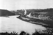 Excavation work was necessary to provide an embankment upon which the approaching track could be laid skirting the shoreline of Hubberston Pill. Public services commenced 7 September 1863. Further track was laid towards the recently constructed docks complex in 1875. A spur to Newton Noyes, known as the 'Estate Line', was completed in 1882. It connected with a pier, which was reached via a lifting bridge at Castle Pill; the junction with the Milford line opposite the station.[5][6] This development highlighted Milford station's less than favorable location, although equidistant between the two major populations of Milford and Hakin, it was at a distance from the quayside and with no discernible pedestrian access. To rectify the issue, the short-lived Hakin Dock Station was constructed in 1898.[5]