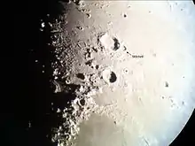 Mitchell is a lunar impact crater, which is attached to the eastern rim of the larger and more prominent crater Aristoteles. It was named after American astronomer Maria Mitchell.[1] The floor of Mitchell is rough and irregular, with a low central rise, being partially filled with the ejecta of the younger Aristoteles. There is a slight notch in the southern rim, and the western wall has been completely absorbed by the rim of Aristoteles.