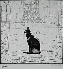 1978 marked the publication of the 54-page "Les yeux du chat" ("Eyes of the Cat"). The dark, disturbing and surreal tale dealt with a blind boy in a non-descript empty cityscape, who has his pet eagle scout for eyes, which it finds by taking these from a street cat and offering them to his awaiting companion who, while grateful, expresses his preference for the eyes of a child. The story premise originated from a brainstorming session Alejandro Jodorowsky had with his fellows of the Académie Panique, a group concentrated on chaotic and surreal performance art, as a response to surrealism becoming mainstream.[84] Jodorowsky worked out the story premise as a therapy to alleviate the depression he was in after the failure of his Dune project and presented the script to Giraud in 1977 during a visit to Paris. Deeming the story too short for a regular, traditional comic, it was Giraud who suggested the story to be told on the format he had already introduced in "Le bandard fou", to wit, as single panel pages. On recommendation of Jodorowsky, he refined the format by relating the eagle's quest on the right-hand pages, while depicting the awaiting boy in smaller single panel left-hand pages from a contra point-of-view. Giraud furthermore greatly increased his already high level of detail by making extensive use of zipatone for the first time.[85] Considered a key and seminal work, both for its art and storytelling, setting Jodorowsky off on his career as comic writer,[86] the art evoked memories of the wood engravings from the 19th century, including those of Gustave Doré, that Giraud discovered and admired in the books of his grandparents when he was living there in his childhood. However, it—like "La déviation"—has remained somewhat of a one-shot in Giraud's body of work in its utilization of such a high level of detail.[87] The story, printed on yellow paper to accentuate the black & white art, was originally published directly as a, to 5000 copies limited book edition, gift item for relations of the publisher.[88] It was only after expensive pirate editions started to appear that the publisher decided to make the work available commercially on a wider scale, starting in 1981.[89][90] Jodorowsky had intended the work to be the first of a trilogy, but that never came to fruition.[91]
