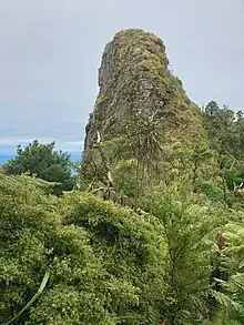 The canopy in the podocarp forest of the lower slopes is tawa, with scattered rimu, kohekohe and a few other trees. The subcanopy has tree ferns, including wheki and ponga, and nikau palm, with pigeonwood (porokaiwhiri), hīnau, pukatea, supplejack (kareao), māhoe, hangehange, kanono and toropapa. Rātā replaces kohekohe at higher levels, until a change to upland forest (dominated by kāmahi, tawheowheo and tāwari) at about 650 m (2,130 ft). Above that, kāmahi, tāwari and tawheowheo become more prominent until at 750 m (2,460 ft) tawa is very rare. Above 800 m (2,600 ft) there are also scattered Hall's totara, miro, rātā and horopito, and, near the summit, pāhautea (at its northern limit on the west coast), but no rimu. Rocky summit pinnacles have the sub alpine species snow tōtara and eyebright (Euphrasia revoluta).[10][12]