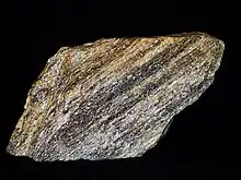 Mylonites are ductilely deformed rocks formed by the accumulation of large shear strain, in ductile fault zones. There are many different views on the formation of mylonites, but it is generally agreed that crystal-plastic deformation must have occurred, and that fracturing and cataclastic flow are secondary processes in the formation of mylonites. Mechanical abrasion of grains by milling does not occur, although this was originally thought to be the process that formed mylonites, which were named from the Greek μύλος mylos, meaning mill.[1] Mylonites form at depths of no less than 4 km.[2]
