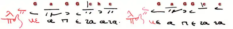 The phthora could intermediate, because it was distinct by its triphonic tone system and its enharmonic genus (the minor tone was always on the top of a tetrachord and smaller than a Western half tone—a diesis). Ioannis Plousiadinos invented an own system of parallage in shape of a square made up by four X. It was constructed to represent the triphonic combinations of conjunct tetrachords, but only the last two X on the bottom described the triphonia of the phthora nana—the triphonia based on echos varys (left) and the triphonia based on the plagios tetartos (right). Both possibilities were illustrated at the end of John Koukouzeles' didactic chant Mega Ison.[10]