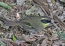 The yellow-throated scrubwren measures 12.5–15 cm (5–6 in) in length. The male bird has a black masked face and ear coverts, with yellow throat and eyebrow. The iris is reddish and upperparts brownish and underparts paler. The wing primaries are yellow and relatively long legs pinkish or cream. The female has a brownish face. Calls include a loud harsh chatter,[10] and a lively song, the latter can be a response to a loud noise such as a car door slamming.[11]