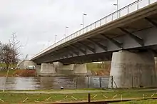 The Nibelungen Bridge (German: Nibelungenbrücke) is a dual road bridge with two sections spanning both arms of the Danube at kilometre mark 2378.39 in Regensburg, Germany. The current bridge, the third on the site, was erected in 2001–04 to replace a bridge erected in 1950 which was no longer adequate for traffic demands, and which had replaced a bridge built in 1938 and destroyed in World War II. Carrying an average of 42,000 vehicles a day, it is one of the most important bridges in the Regensburg area.