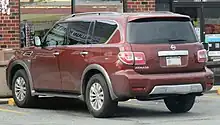 The Nissan Armada (retrospectively referred to unofficially as the Nissan Pathfinder Armada) is a full-size SUV manufactured by Nissan for the North American market. From 2003 to 2015, the first-generation Armada was assembled in Canton, Mississippi based on the Nissan Titan.[1] From mid-2016 onwards, the second-generation Armada has been built in Yukuhashi, Kyushu, Japan and shares the same platform as the Nissan Patrol, with American-specific modifications, and went on sale in late mid-2016 as a 2017 model. A luxury version of the Armada has been sold as the Infiniti QX80 (originally QX56).