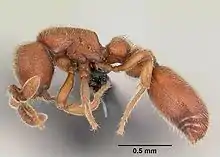 Ooceraea biroi, the clonal raider ant,[1] is a queenless clonal ant in the genus Ooceraea (recently transferred from the genus Cerapachys).[2][3] Native to the Asian mainland, this species has become invasive on tropical and subtropical islands throughout the world.[4] Unlike most ants, which have reproductive queens and mostly nonreproductive workers, all individuals in a O. biroi colony reproduce clonally via thelytokous parthenogenesis.[5][6] Like most dorylines, O. biroi are obligate myrmecophages and raid nests of other ant species to feed on the brood.[5][7]