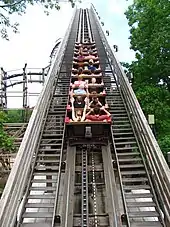 Outlaw Run is a wooden roller coaster located at Silver Dollar City in Branson, Missouri. Designed by Alan Schilke, Outlaw Run is the first wooden roller coaster manufactured by Rocky Mountain Construction (RMC) and became the first wooden coaster with multiple inversions.[2][3][4] It features a 162-foot (49 m) drop, three inversions, and a maximum speed of 68 mph (109 km/h), making Outlaw Run the sixth-fastest wooden coaster in the world. Its 81-degree first drop is also the fourth steepest in the world among wooden roller coasters.