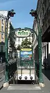 The Guimard entrances received a generally warm reception.[10] Salvador Dalí later called them "those divine entrances to the Métro, by grace of which one can descend into the region of the subconscious of the living and monarchical aesthetic of tomorrow".[3][19] By way of what became known as le style Métro,[6] they popularized Art Nouveau, which had been a style known largely to connoisseurs of the avant garde.[20]