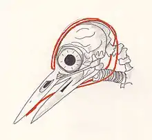 Many of the foraging, breeding, and signaling behaviors of woodpeckers involve drumming and hammering using their bills.[12] To prevent brain damage from the rapid and repeated powerful impacts, woodpeckers have a number of physical features that protect their brains.[13] These include a relatively small and smooth brain, narrow subdural space, little cerebrospinal fluid surrounding it to prevent it from moving back and forth inside the skull during pecking, the orientation of the brain within the skull (which maximises the contact area between the brain and the skull) and the short duration of contact. The skull consists of strong but compressible, sponge-like bone, which is most concentrated in the forehead and the back of the skull.[13] Another anatomical adaptation of woodpeckers is the enormously elongated hyoid bone which subdivides, passes on either side of the spinal column and wraps around the brain case, before ending in the right nostril cavity. It plays the role of safety-belt.[9]