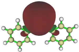 Diphenyllead, (C6H5)2Pb was computed with GAMESS at the B3PW91 level of theory using the basis sets 6-311+G(2df,p) for C and H and def2-svp for Pb with the ECP60MDF pseudopotential, in an adapted procedure (which uses the cc-pVTZ basis set for Pb instead).[11] The molecular orbitals (MOs) (visualized using Chimera[12]) and natural bond orbitals (NBOs) (visualized using multiwfn[13]) generated are produced below, and qualitatively identical to the literature.[11] As expected, the HOMO is 6s-dominated, and the LUMO is 6p-dominated. The NBOs are of the 6s lone pair and vacant 6p orbital respectively.